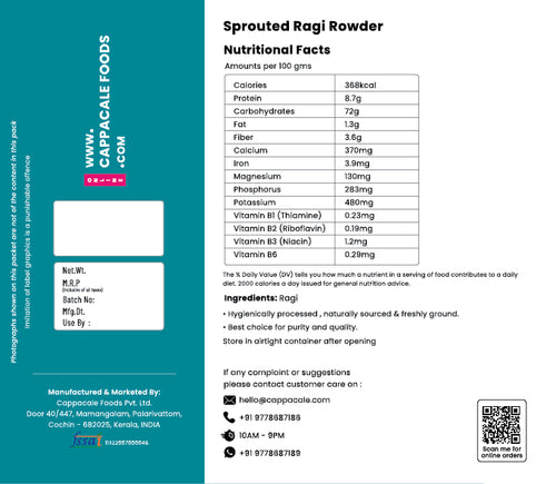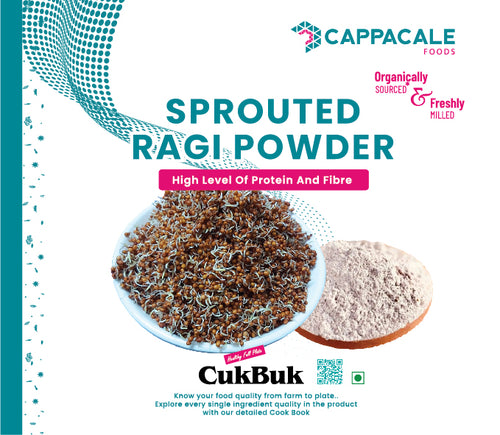 Cappacale Sprouted Ragi Powder is a nutritious and wholesome food made from 100% organic quality ragi (finger millet). It is sprouted to enhance nutrient assimilation and make it easier to digest. This powder is free from salt, sugar, additives, and preservatives. Ragi is known for its high calcium content, having 10 times more calcium than wheat and rice and three times more than milk, making it great for bone health.